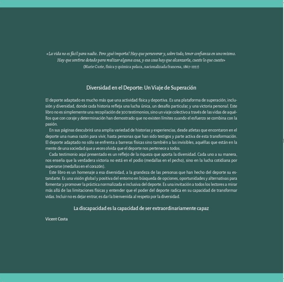 Enfatiza que el deporte adaptado e inclusivo debe ser entendido como un derecho fundamental, y no como una actividad opcional. El libro refuerza como idea central sensibilizar a la sociedad sobre la importancia de adaptar las prácticas deportivas para que sean accesibles para todos, independientemente de sus capacidades, y proporcionar herramientas y recursos para fomentar la inclusión en el ámbito deportivo.